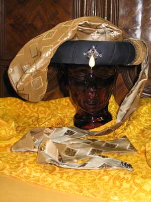 mit Beutel am Roundlet statt Chaperon und zwei Sendelbinden. (Brokat und schwarzer Samt)