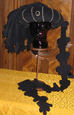 Chaperon Krempe 05 - Agnus - rotes und schwarzes Leinen, Perlen, kleine goldene Plättchen.